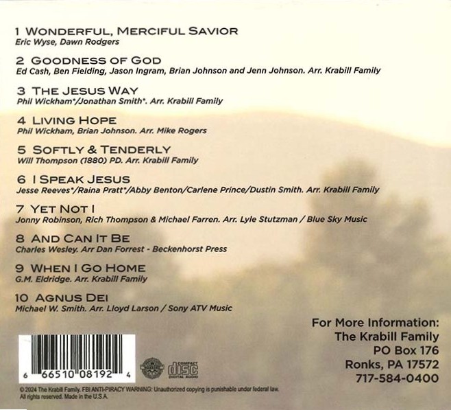 Wonderful, Merciful Savior• Goodness of God• The Jesus Way• Living Hope• Softly & Tenderly• I Speak Jesus• Yet Not I• And Can It Be• When I Go Home• Agnus Dei