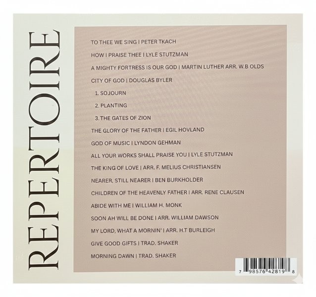 To Thee We Sing• How I Praise Thee• A Mighty Fortress Is Our God• City of God• The Glory of The Father• God of Music• All Your Works Shall Praise You• The King of Love• Nearer, Still Nearer• Children Of The Heavenly Father• Abide with Me• Soon Ah Will Be Done• My Lord, What A Mornin’• Give Good Gifts• Morning Dawn