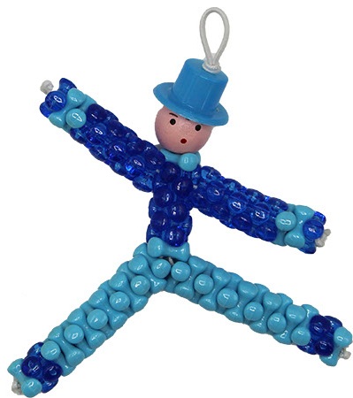 Tri beads strung together with body, arms, legs and a head with hat. 4" tall. Colors: Blue, Pink, or Yellow.