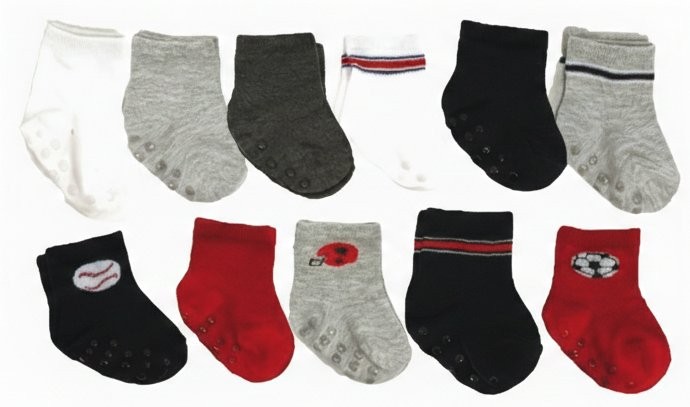 Infant crew socks with a reinforced toe. and a knitted heel. 97% Polyester, 3% Spandex. Sizes: 0-6 months, 6-12, or 12-24. Colors: Assorted Boy or Girl. 11 pair pack.