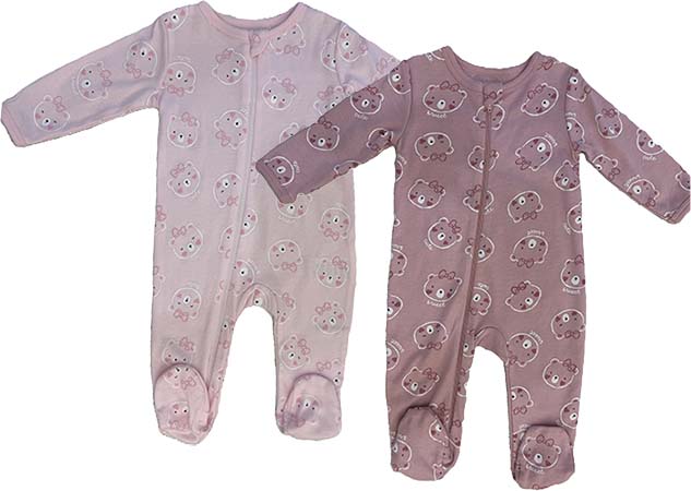 One-piece zippered sleep and plays outfit. Footed to keep tiny feet warm. The soft fabric contains: 60% cotton, 40% polyester. Color: Netural, Blue, and Pink. Sizes: 0-3 months, 3-6 months, 6-9 months.