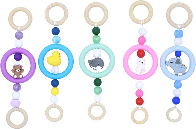 Colorful silicone beads with a wooden loop at each end and a cute animal in the middle loop. Made by Happy Horizon Workshop. Assorted. 10"