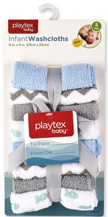 100% Polyester terry washcloths are soft, absorbent, and durable. 6 per pack. Size: 9” x 9”. Colors: Blue or neutral. Color and design may vary..