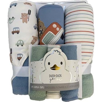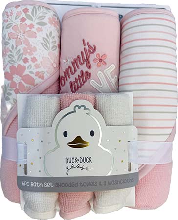 The ultra-soft and highly absorbent six-piece set featuring three washcloths, three hooded towels, Washcloths: 9" x 9"; Towels: 28" x 28" 100% Polyester. Colors: Blue, Pink or Tan