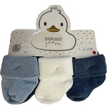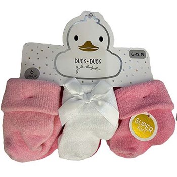 Soft, thick terry baby socks to keep tiny feet warm. 8 pair per pack. Contains: 77% cotton, 21% polyester, 2% spandex. Color: Pink/Tan and Blue/Tan. Sizes: 0-6 months, 6-12 month.