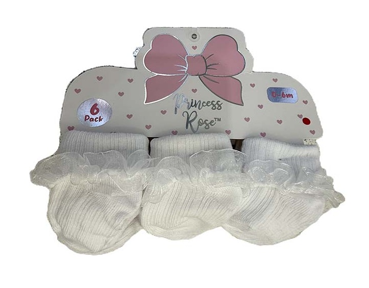 Soft dainty baby socks to keep tiny feet warm. Lace trimmed. 6 pair per pack. Contains: 95% polyester, 5% spandex. Color: White. Sizes: 0-6 months, 6-12 month.