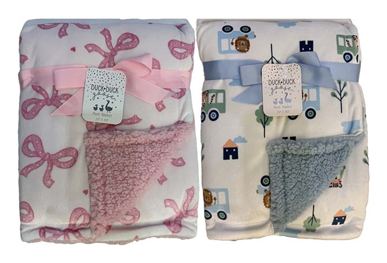 Our soft fleece baby blanket features a double layer fabric with super soft plush backing. 30” x 40” 100% polyester. Colors: Blue or Pink.