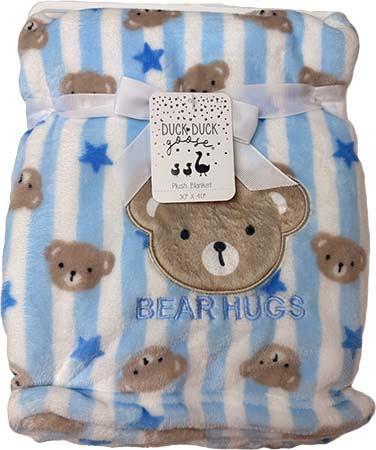Our soft fleece baby blanket features super soft fleece with a cute applique. 30” x 40” 100% polyester. Products may vary. Color: Pink or Blue.