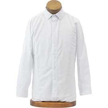 Wrinkle-resistant, easy care long sleeve dress shirt with pointed collar, front pocket, and pleated back. 65% Polyester 35% Cotton broadcloth. Comfortable and stays white. White. Sizes: Toddlers: 12 mo., 18 mo., 24 mo., 2T, 3T, 4T. Boys: 4, 5, 6, 7, 8, 10, 12, 14, 16, 18. White or Blue. Men: 32/33: 14.5, 15, 15.5, 16, 16.5, 17, 17.5, 18, 18.5, 19, 20; 34/35: 15, 15.5, 16, 16.5, 17, 17.5, 18, 18.5, 19, 20; White Only. 36/37: 15.5, 16, 16.5, 17, 17.5, 18, 18.5.