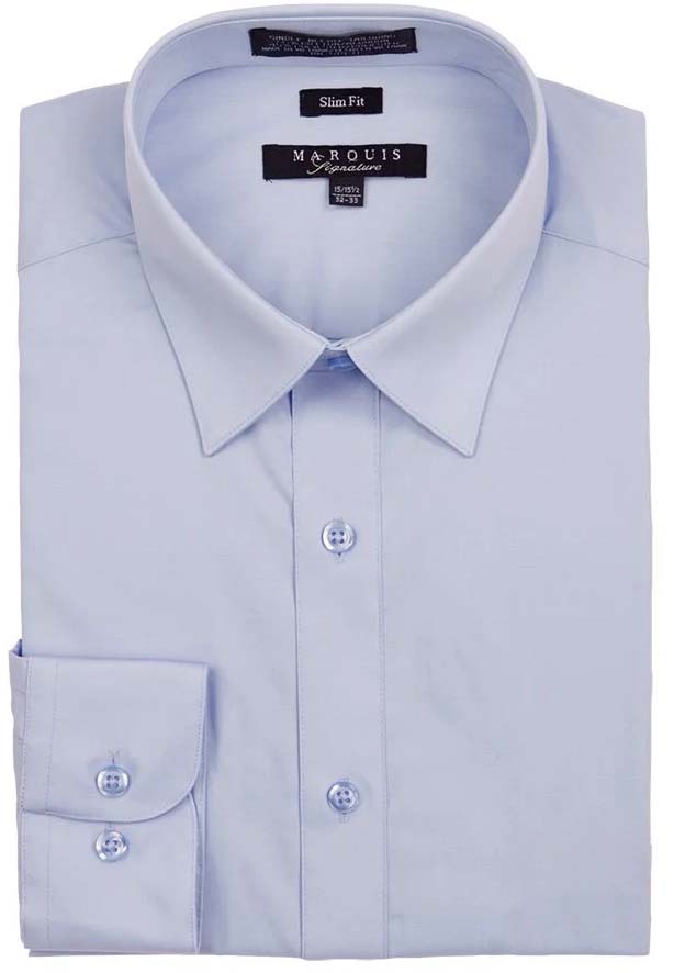 A basic marquis wrinkle-resistant, long sleeve dress shirt, something every man needs in his wardrobe. Point collar, One left chest pocket. 55% cotton 45% polyester. Slim. Colors: White, Charcoal, Light Blue, and Silver. Sleeve sizes: 32/33 Neck Sizes: 14.5, 15.5, 16.5, 17.5 Sleeve Size: 34/35 Neck: 15.5, 16.5, 17.5, 18.5. Larger size available by special order.