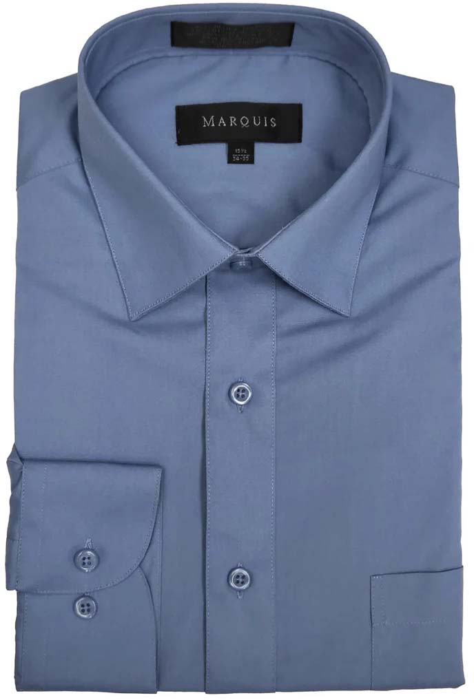 A basic marquis wrinkle-resistant, long sleeve dress shirt, something every man needs in his wardrobe. Point collar, One left chest pocket. 55% cotton 45% polyester. Colors: White, Charcoal, Light Blue, Silver, Sage, and Blue Steel. Sleeve sizes: 32/33 Neck Sizes: 14.5-17.5 Sleeve Size: 34/35 Neck: 15.5-19.5 Larger sizes available by special order.