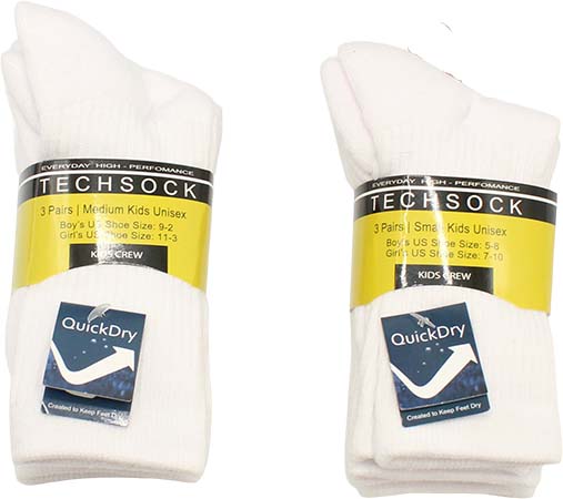 Boy's everyday high-performance crew socks with a reinforced toe, cushioned foot, and a knitted heel. Quick Dry to keep your feet dry. 98% Polyester, 2% Spandex. Socks sizes (Shoe Sizes): Small (5-8) and Med (9-2). Color: White. 3 pair pack.