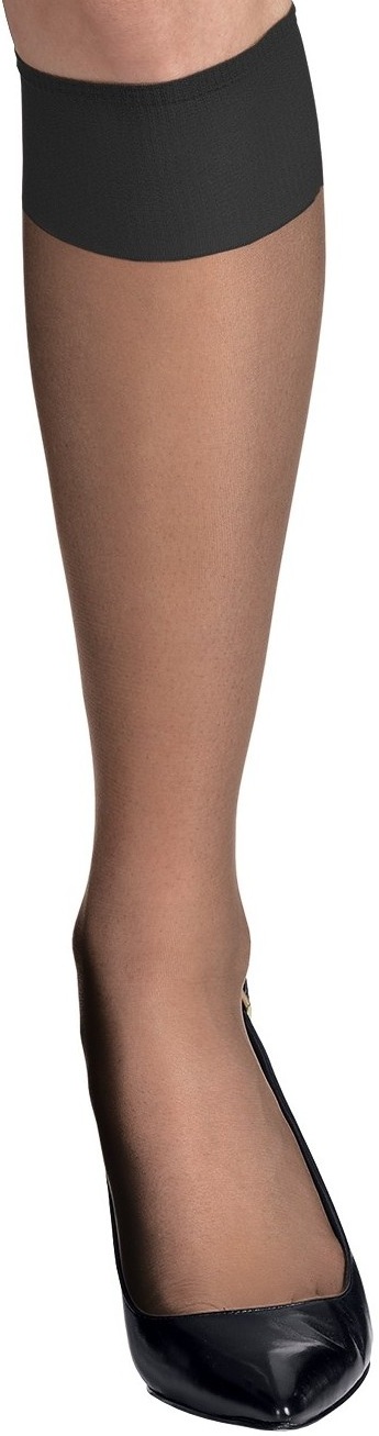 Sheer knit blends nylon/spandex for sleek fit and silky feel. Wide top band stays up without binding, for comfort hour after hour. Sheer toe. One size fits most. 15 denier, sheer appearance. 85% nylon, 15% spandex. Jet Black, Barely Black, Barely There, or Little Color.. 2 pair pack.
