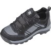 Nubuck leather with suede upper and synthetic lining. Cushioned insole, non-marking outsole. Round toe. Black with gray. 5 eyelets. Sizes: W 7-6 includes half sizes.
