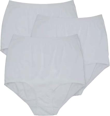 Soft knit cotton full coverage panties for everyday comfort. Sewn-on 3/8” elastic waistband and leg band with picot edge. Sewn-in cotton crotch liner. High rise. White. 100% cotton. 3 pair pack. Sizes: 5-12.