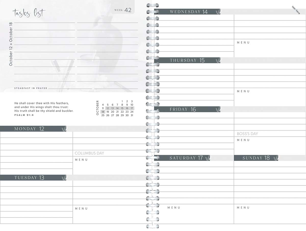 A woman's life consists of many details, calling for organization. Designed for busy moms, but adaptable to any homemaker's needs. Features yearly overview by month, perforated shopping lists, to-do lists, menu planner, and more. Spiral bound cover. 5 1/2" x 8 1/2".