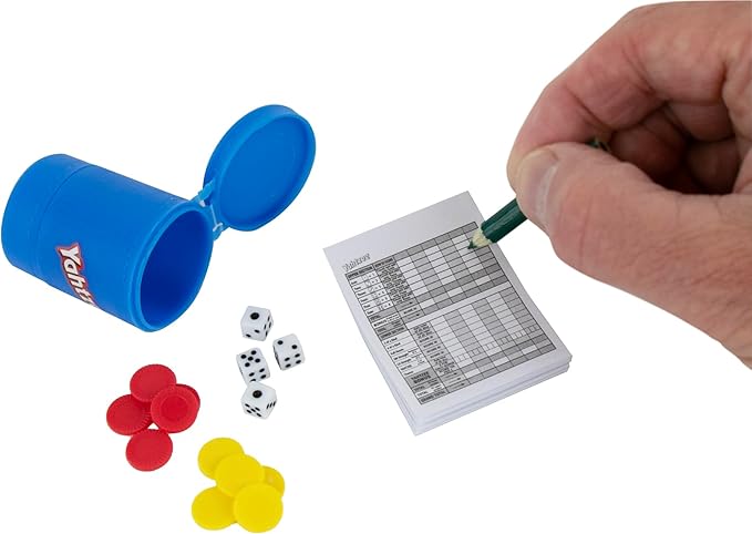 Just like the full size version. Includes 1 cup, 5 dice, 10 chips, 2 pencils, and score cards. 1.75" X 1"